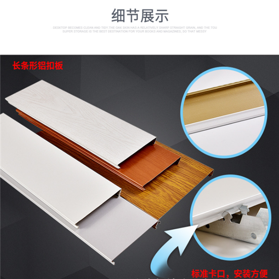 優(yōu)秀的板面涂層功能。優(yōu)質(zhì)的鋁扣板一般采用優(yōu)質(zhì)涂料,由進(jìn)口全自動高速涂裝線涂裝,板面平坦,無色差,涂層附著力強(qiáng),能耐酸、堿、鹽霧的腐蝕,長期不變色,涂料不掉落,氟碳涂層板是野外運(yùn)用的極為抱負(fù)的裝飾資料,運(yùn)用壽命二十年以上,且保養(yǎng)便利,用水沖刷便潔凈如新。